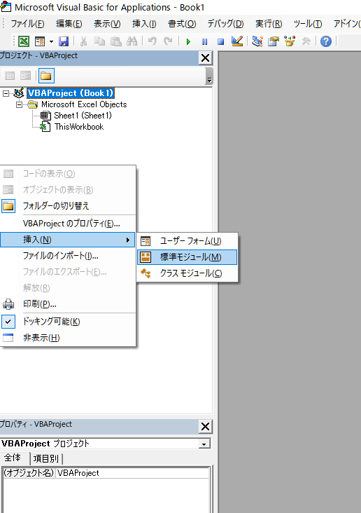 メニューが表示されたら「挿入」→「標準モジュール」を選択して下さい。